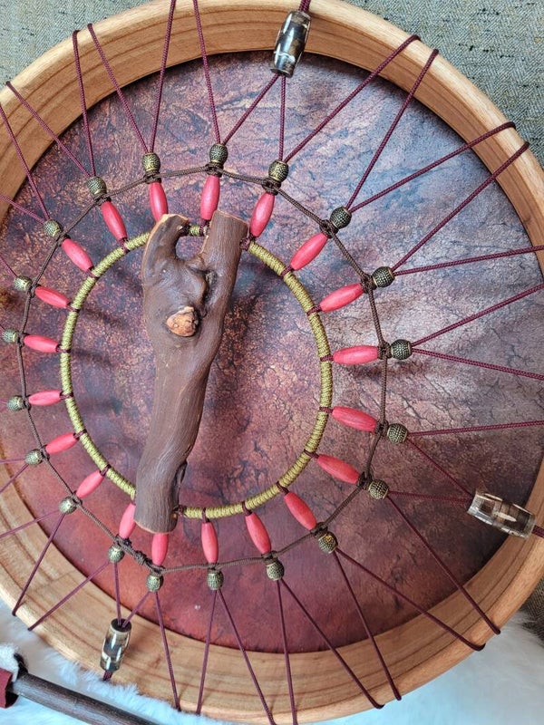 Is een drum met brontaal/broncodes, gemaakt op een frame van 50 cm rode neemhout, de huid van een Aziatisch Hert en het handvat is van de druivenrank.