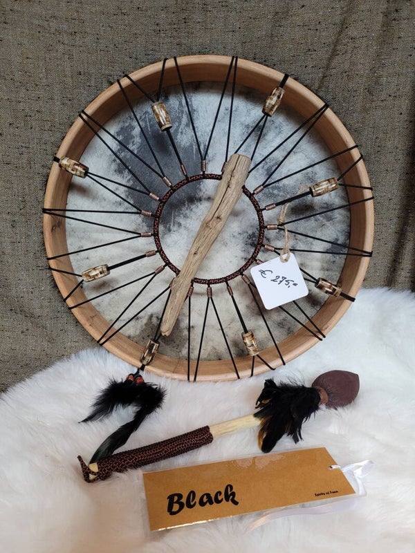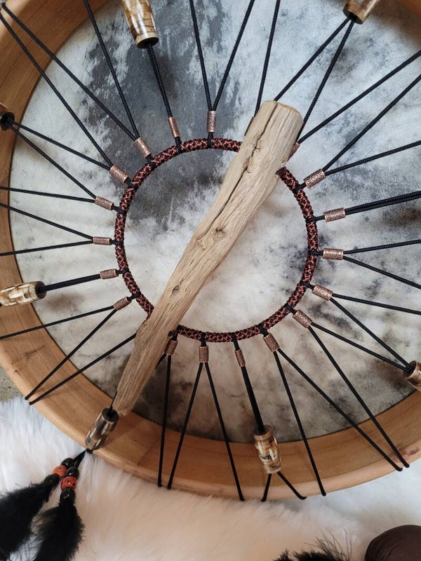 Een drum met een Neem houten frame van 45 cm en een handvat van Eikenhout gespannen met een Buffelhuid met haar.